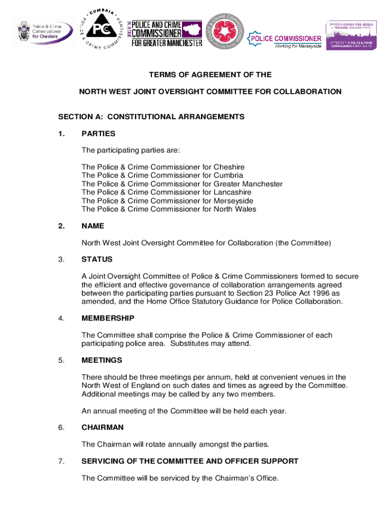 TERMS OF AGREEMENT OF THE NORTH WEST JOINT OVERSIGHT COMMITTEE FOR COLLABORATIONSECTION A: CONSTITUTIONAL ARRANGEMENTS 1.PARTIES The participating parties are: The Police & Crime Commissioner for