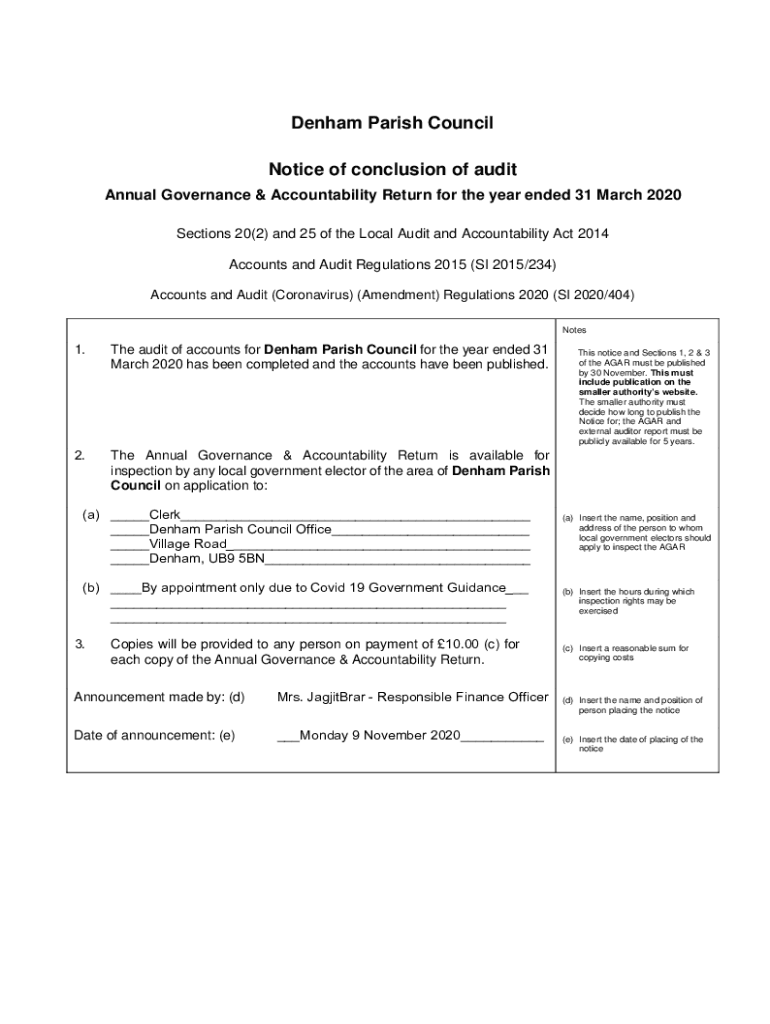 Den ham Parish Council Notice of conclusion of audit Annual Governance & Accountability Return for the year ended 31 March 2020 Sections 20(2) and 25 of the Local Audit and Accountability Act 2014