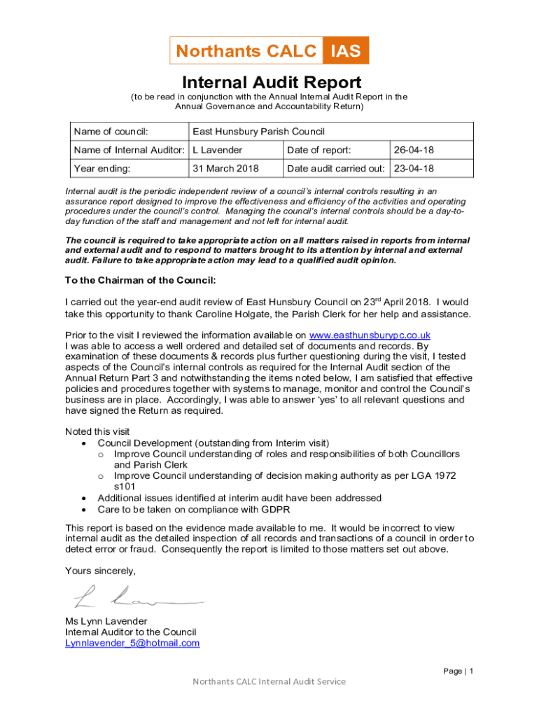 North ants CALL IAS Internal Audit Report (to be read in conjunction with the Annual Internal Audit Report in the Annual Governance and Accountability Return)Name of council:East Huns bury Parish