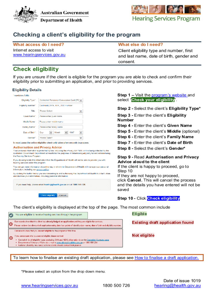 Checking a clients' eligibility for the program What access do I need? What else do I need? Client eligibility type and number, first and last name, date of birth, gender and consent. Internet access