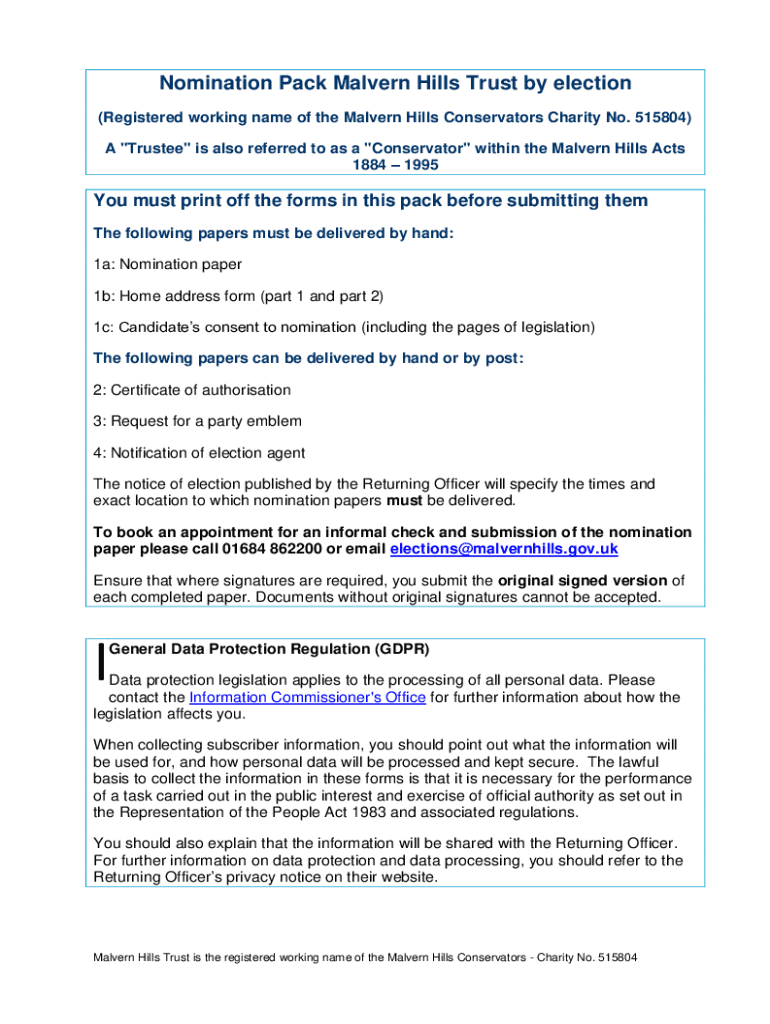 Nomination pack Malvern Hills is a set of forms and documents required for individuals to become a candidate for a specific position in Malvern Hills.