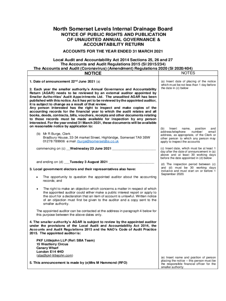 North Somerset Levels Internal Drainage Board NOTICE OF PUBLIC RIGHTS AND PUBLICATION OF UNAUDITED ANNUAL GOVERNANCE & ACCOUNTABILITY RETURN ACCOUNTS FOR THE YEAR ENDED 31 MARCH 2021 Local Audit and