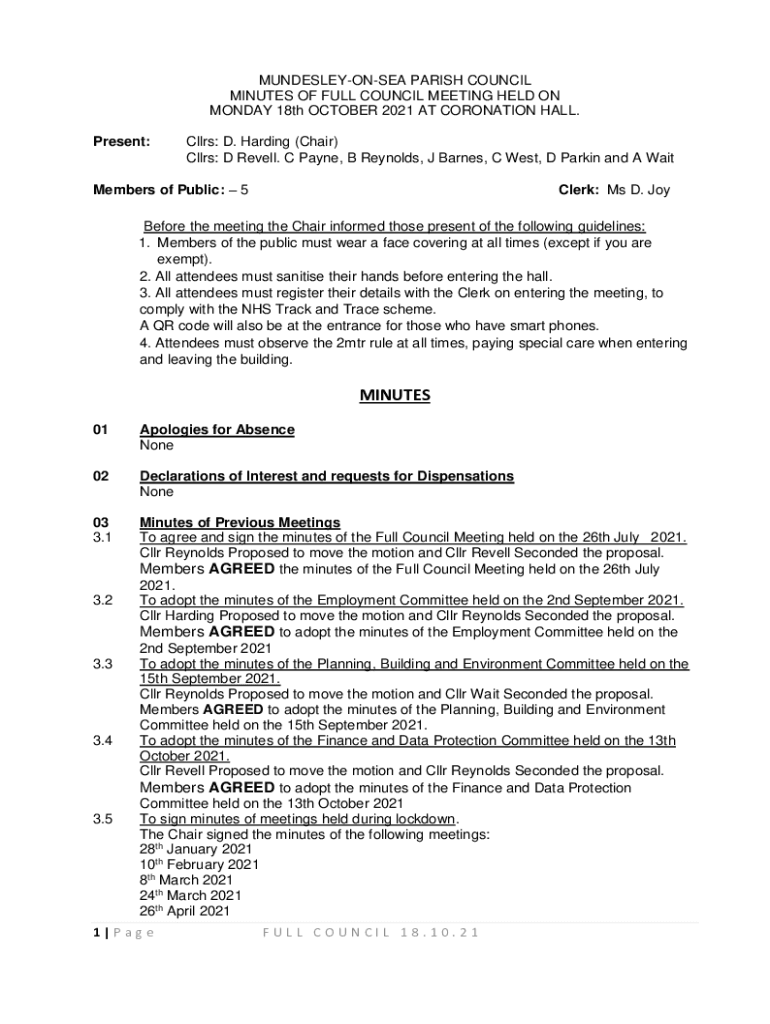 MUNDESLEYONSEA PARISH COUNCIL MINUTES OF FULL COUNCIL MEETING HELD ON MONDAY 18th OCTOBER 2021 AT CORONATION HALL. Present:Class: D. Harding (Chair) Class: D Reveal. C Payne, B Reynolds, J Barnes,