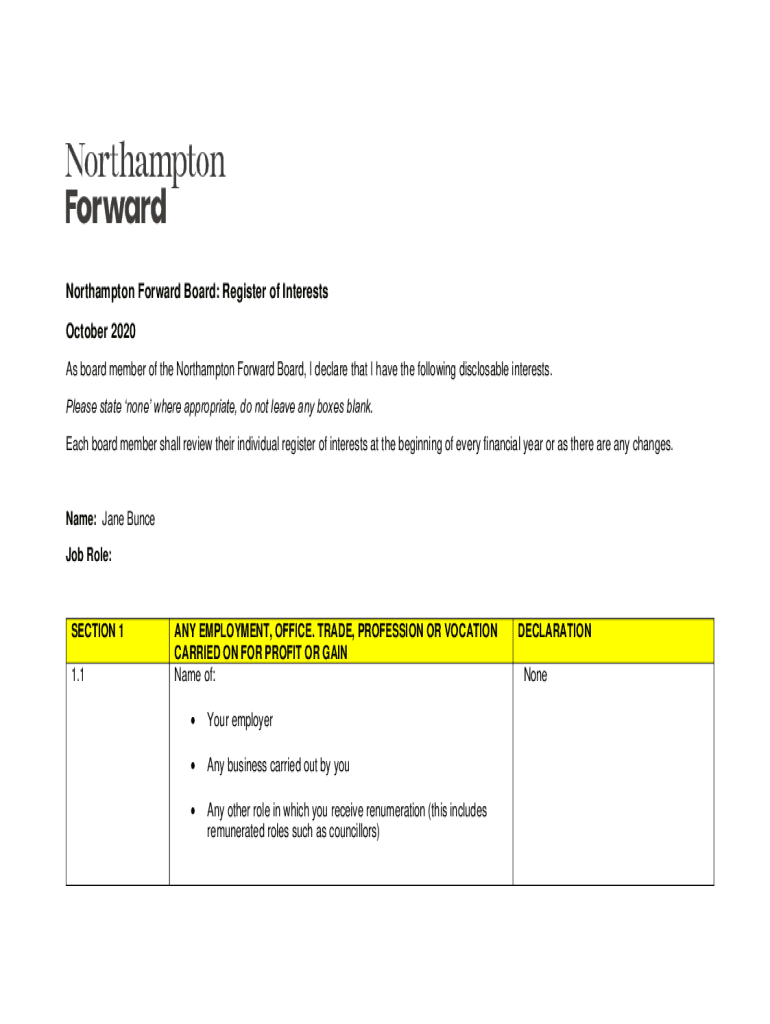 Northampton Forward Board: Register of Interests October 2020 As board member of the Northampton Forward Board, I declare that I have the following disclosable interests. Please state none where appropriate,