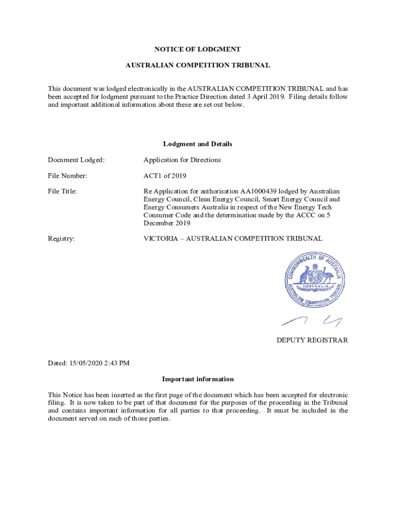 This document was lodged electronically in the AUSTRALIAN COMPETITION TRIBUNAL and has