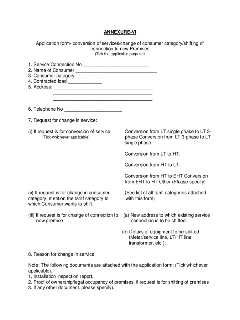 ANNEXUREVI Application form conversion of services/change of consumer category/shifting of connection to new Premises (Tick the applicable purpose)1. Service Connection No.___ 2. Name of Consumer