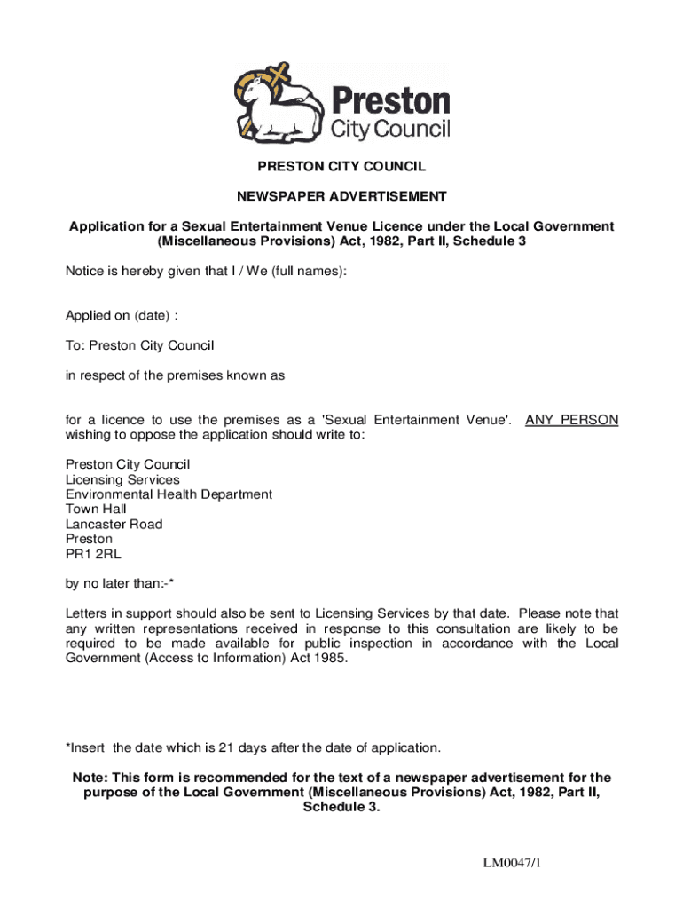 PRESTON CITY COUNCIL NEWSPAPER ADVERTISEMENT Application for a Sexual Entertainment Venue License under the Local Government (Miscellaneous Provisions) Act, 1982, Part II, Schedule 3 Notice is hereby