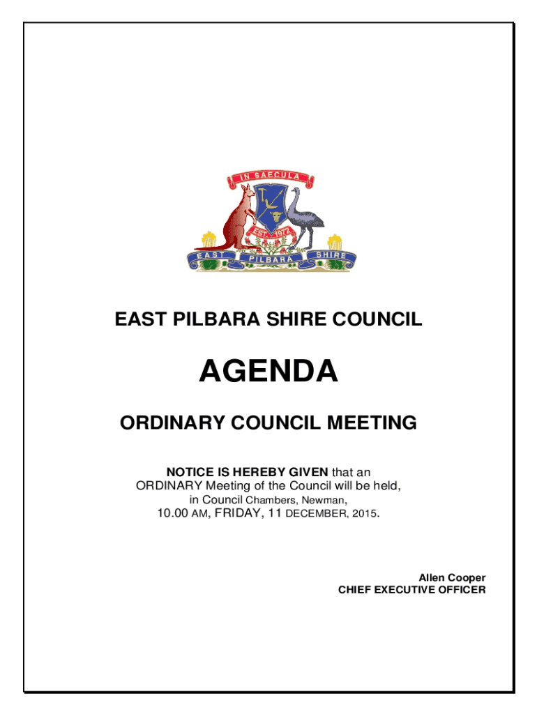 EAST PILLAR SHIRE COUNCILAGENDA ORDINARY COUNCIL MEETING NOTICE IS HEREBY GIVEN that an ORDINARY Meeting of the Council will be held, in Council Chambers, Newman, 10.00 AM, FRIDAY, 11 DECEMBER, 2015.