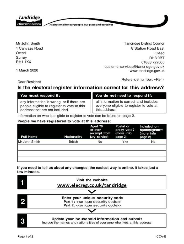 Mr John Smith 1 Canvass Road Opted Surrey RH1 1XXTandridge District Council 8 Station Road East Opted RH8 0BT 01883 722000 customerservices@tandridge.gov.uk www.tandridge.gov.uk1 March 2020Reference