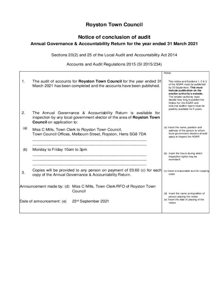 $$STARTLETHEAD/pagerefHT0087/town.clerk@FNPFnLittle johnl.gov.uk/efsba@pkflittlejohn.co.uk/FNPF Little john LLP/e\'HT0087 2020/21 AGAR Section 3 External Auditor Report\'/G:vmrbroadforms102215.bod/$$Royston