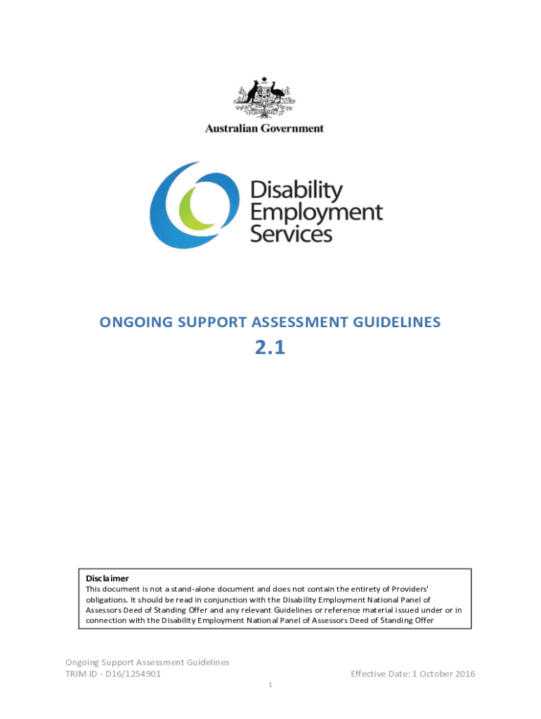 ONGOING SUPPORT ASSESSMENT GUIDELINES2.1Disclaimer This document is not a standalone document and does not contain the entirety of Providers\' obligations. It should be read in conjunction with the