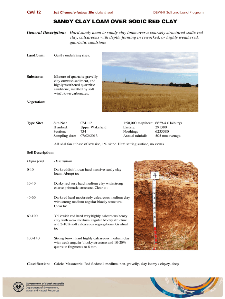 CM112Soil Characterization Site data sheetDEWNR Soil and Land ProgramSANDY CLAY LOAM OVER SONIC RED CLAY