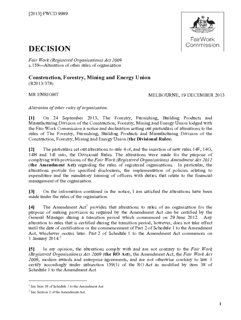 [2013] FWD 9989DECISION Fair Work (Registered Organizations) Act 2009 s.159Alteration of other rules of organisationConstruction, Forestry, Mining and Energy Union (R2013/378) MR ENRIGHTMELBOURNE,