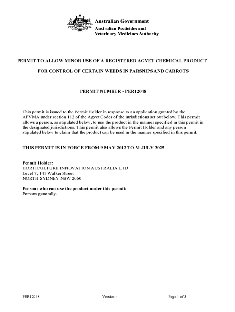 PERMIT Allowing MINOR USE OF A REGISTERED AGV ET CHEMICAL PRODUCT FOR CONTROL OF CERTAIN WEEDS IN PARSNIPS AND CARROTSPERMIT NUMBER PER12048This permit is issued to the Permit Holder in response to