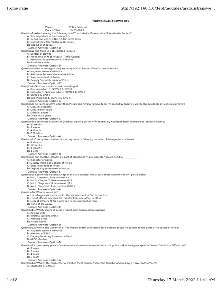 Home Pagehttp://192.168.1.6/dept/modules/mark list/answer...PROVISIONAL ANSWER Flypaper: Date of TestPolice Manual 17032022Question1:Which among the following is NOT included in Kerala police Subordinate