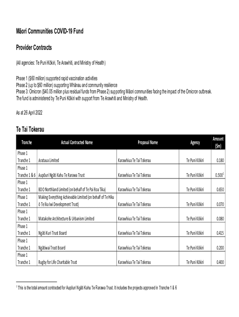 More Communities COVID-19 Fund Provider Contracts (All agencies: Te Punk Kirk, Te Graffiti, and Ministry of Health) Phase 1 ($60 million) supported rapid vaccination activities Phase 2 (up to $60