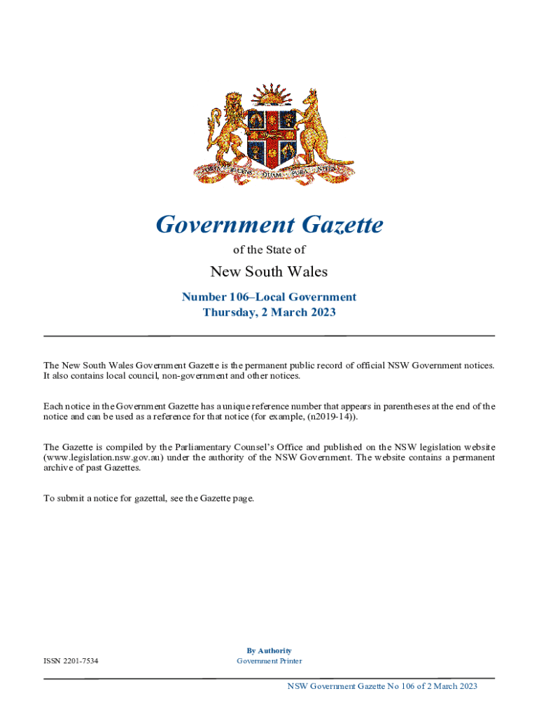 GOVERNMENT GAZETTE 4 September 2020Government Gazette of the State one South Wales Number 106Local Government Thursday, 2 March 2023The New South Wales Government Gazette is the permanent public record