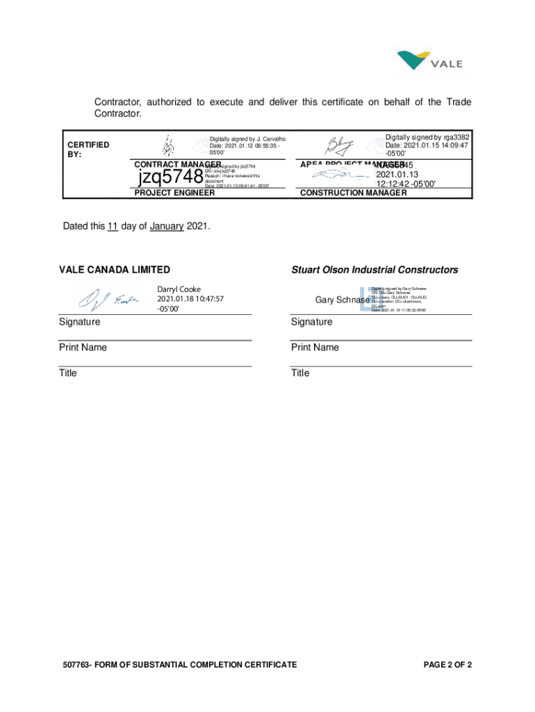 FORM OF SUBSTANTIAL COMPLETION CERTIFICATE SUBSTANTIAL COMPLETION CERTIFICATE Company:VALE CANADA LIMITEDProject:CLEAN AER PROJECTProject Address:18 Rink Street, Copper Cliff, Ontario, P0M 1N0Identification