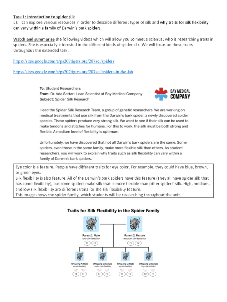Task 1: Introduction to spider silk LT: I can explore various resources in order to describe different types of silk and why traits for silk flexibility can vary within a family of Darwin's bark spiders.