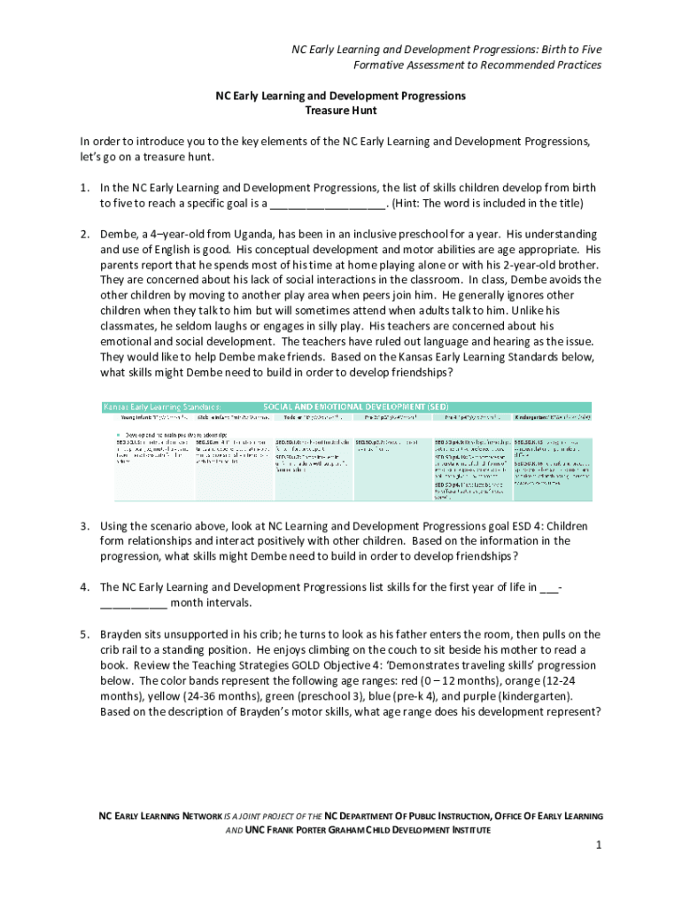 NC Early Learning and Development Progressions: Birth to Five Formative Assessment to Recommended Practices NC Early Learning and Development Progressions Treasure Hunt In order to introduce you to
