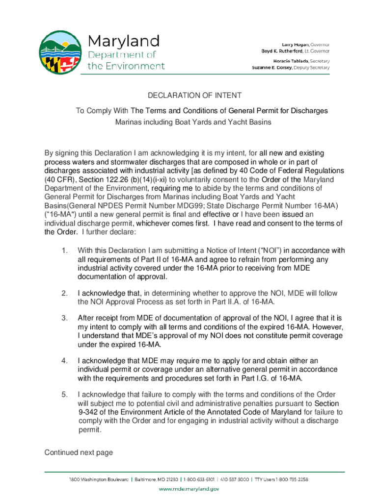 DECLARATION OF INTENT To Comply With The Terms and Conditions of General Permit for Discharges Marinas including boatyards and Yacht Basins signing this Declaration I am acknowledging it is my intent,