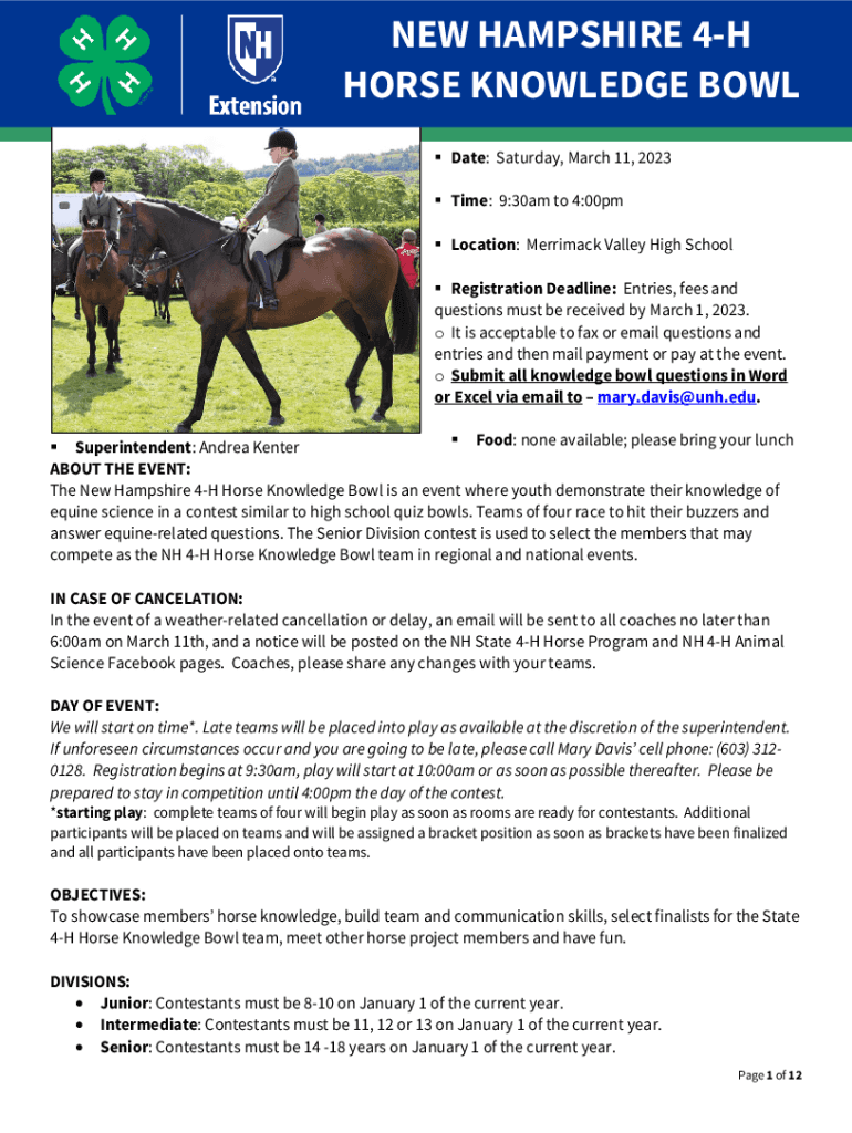 NEW HAMPSHIRE 4H HORSE KNOWLEDGE BOWL Date: Saturday, March 11, 2023, Time: 9:30am to 4:00pm Location: Merrimack Valley High School Registration Deadline: Entries, fees and questions must be received