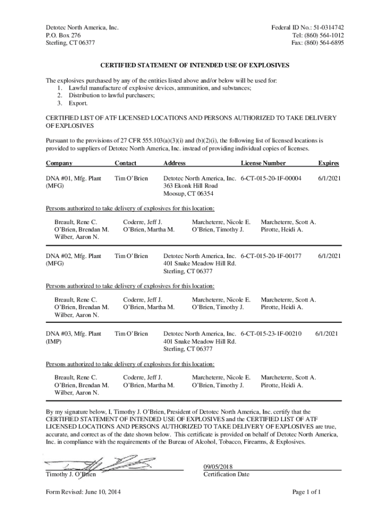 Devoted North America, Inc. P.O. Box 276 Sterling, CT 06377Federal ID No.: 510314742 Tel: (860) 5641012 Fax: (860) 5646895CERTIFIED STATEMENT OF INTENDED USE OF EXPLOSIVES The explosives purchased