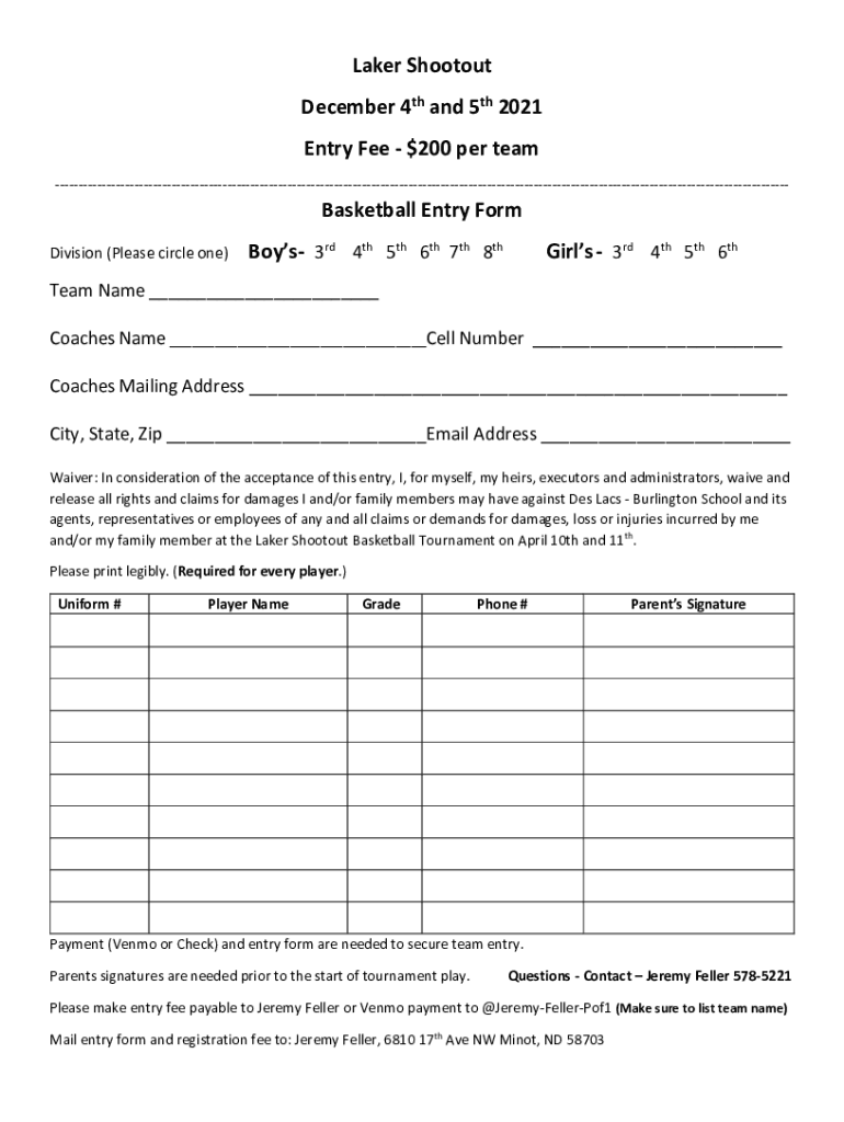 Later Shootout December 4th and 5th 2021 Entry Fee $200 per team Basketball Entry Form Division (Please circle one)Boys 3rd 4th 5th 6th 7th 8thGirls 3rd 4th 5th 6thTeam Name ___ Coaches Name ___Cell