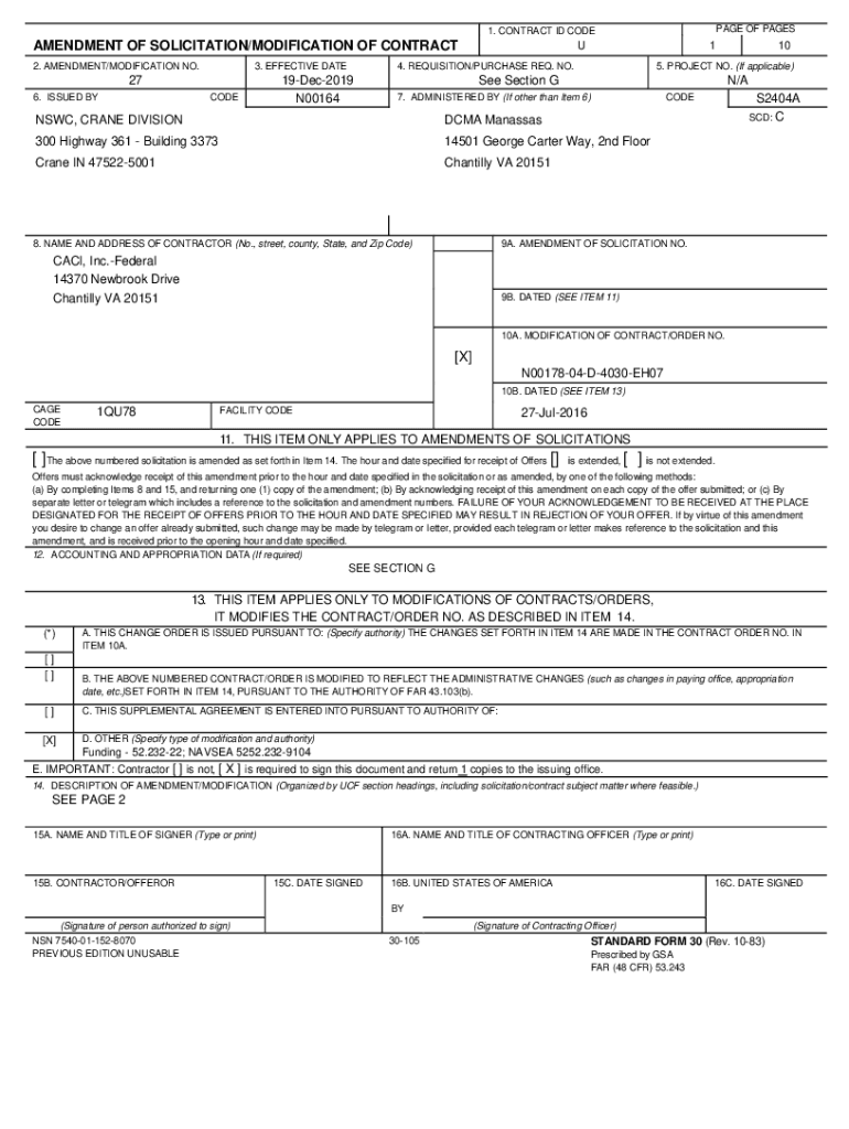 PAGE OF PAGES1. CONTRACT ID CODEPENDENT OF SOLICITATION/MODIFICATION OF CONTRACT 2. AMENDMENT/MODIFICATION NO.3. EFFECTIVE DATE27 6. ISSUED BYCODE1U4. REQUISITION/PURCHASE REQ. NO.19Dec2019 N001645.