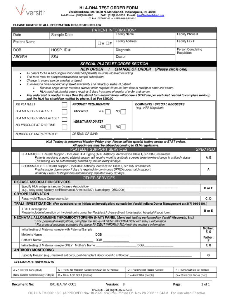 The IBC HLA-DNA test order can be filled out by the healthcare provider with all the necessary patient information and test specifications.