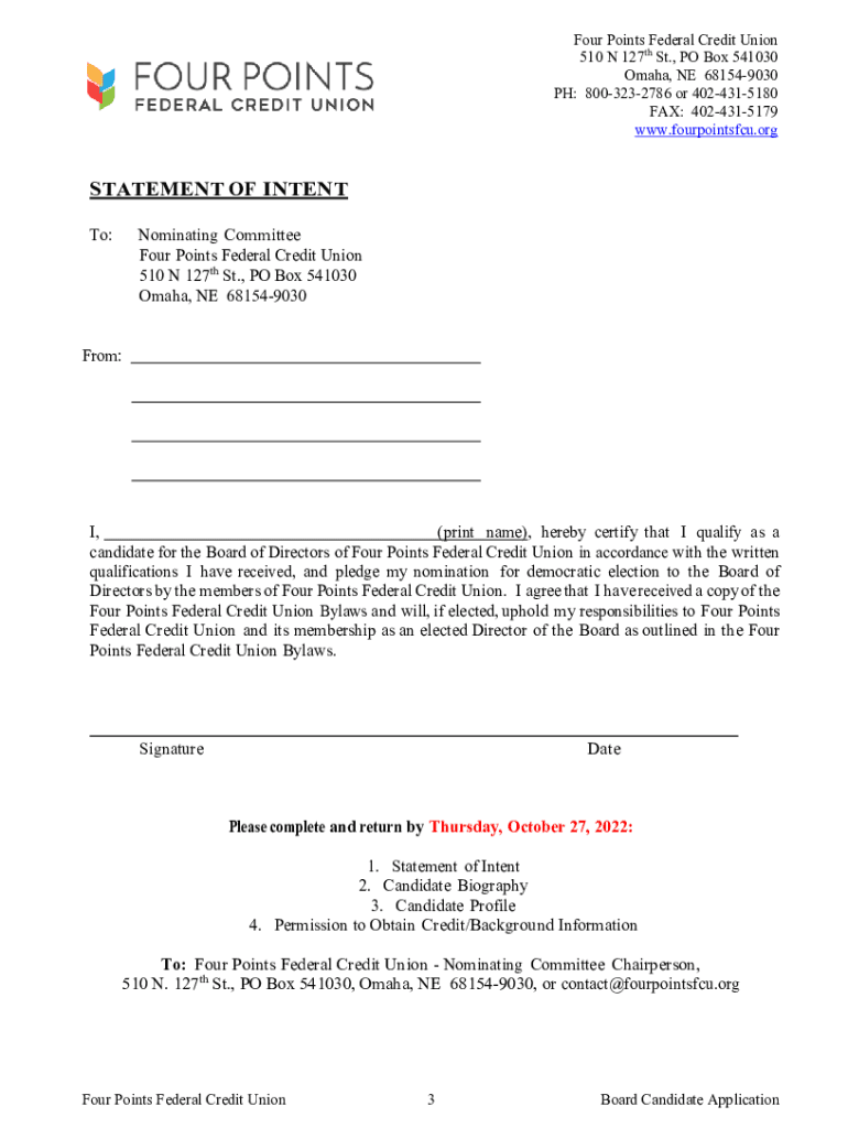 Four Points Federal Credit Union Four TH 510 N 127 St., PO Box 541030 510 N 127 St., PO Box 541030 Omaha, NE 681549030 681549030 Omaha, PH: 8003232786 8003232786 or 4024315180 4024315180 PH: FAX: