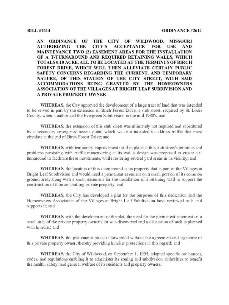 BILL #2614ORDINANCE #2614AN ORDINANCE OF THE CITY OF WILDWOOD, MISSOURI AUTHORIZING THE CITY\'S ACCEPTANCE FOR USE AND MAINTENANCE TWO (2) EASEMENT AREAS FOR THE INSTALLATION OF A TURNAROUND AND REQUIRED