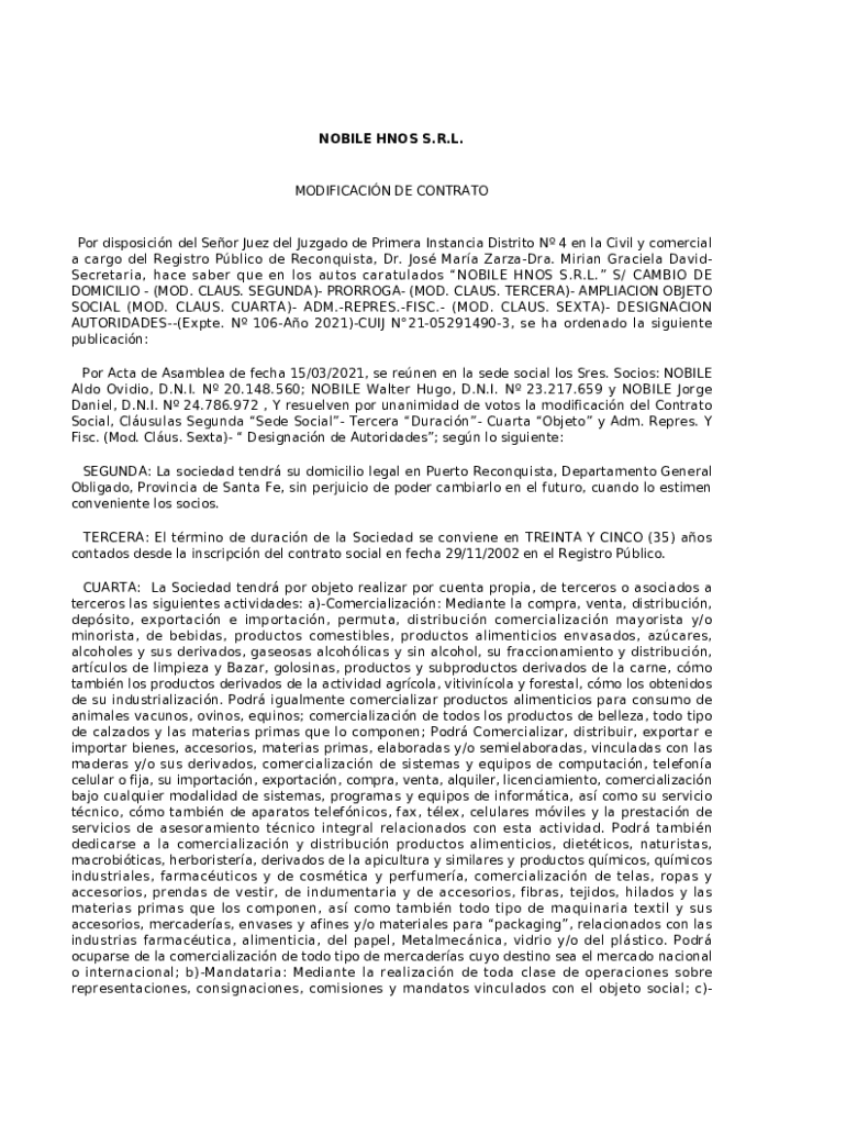 Obtener el gratis NOBILE HNOS S.R.L. MODIFICACIN DE CONTRATO Por ...