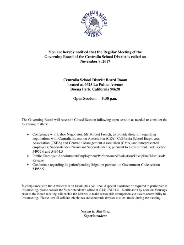 You are hereby notified that the Regular Meeting of the Governing Board of the Central School District is called on November 8, 2017Centralia School District Board Room located at 6625 La Palma Avenue