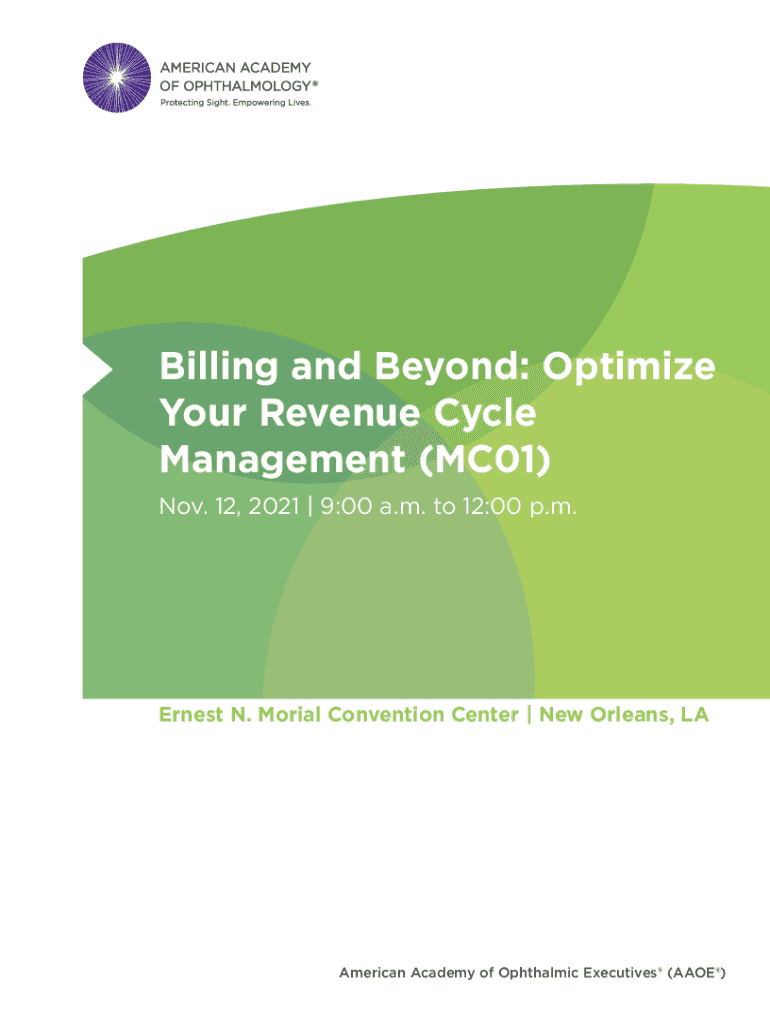 Billing and Beyond: Optimize Your Revenue Cycle Management (MC01) Nov. 12, 2021 | 9:00 a.m. to 12:00 p.m. Ernest N. Moral Convention Center | New Orleans, LA American Academy of Ophthalmic Executives