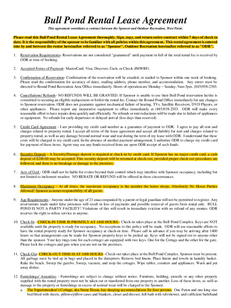 Bull Pond Rental Lease Agreement This agreement constitutes a contract between the Sponsor and Outdoor Recreation, West Point. Please read this Bull Pond Rental Lease Agreement thoroughly. Sign, copy,