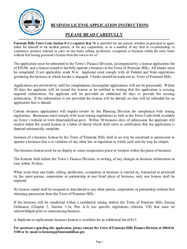 BUSINESS LICENSE APPLICATION INSTRUCTIONSPLEASE READ CAREFULLY Fountain Hills Town Code Section 811 requires that it is unlawful for any person, whether as principal or agent, either for himself or
