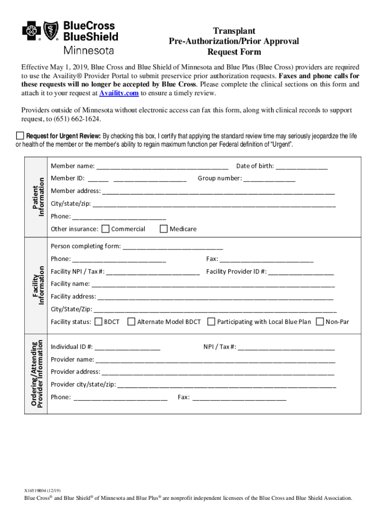 Transplant PreAuthorization/Prior Approval Request Form Effective May 1, 2019, Blue Cross and Blue Shield of Minnesota and Blue Plus (Blue Cross) providers are required to use the Ability Provider