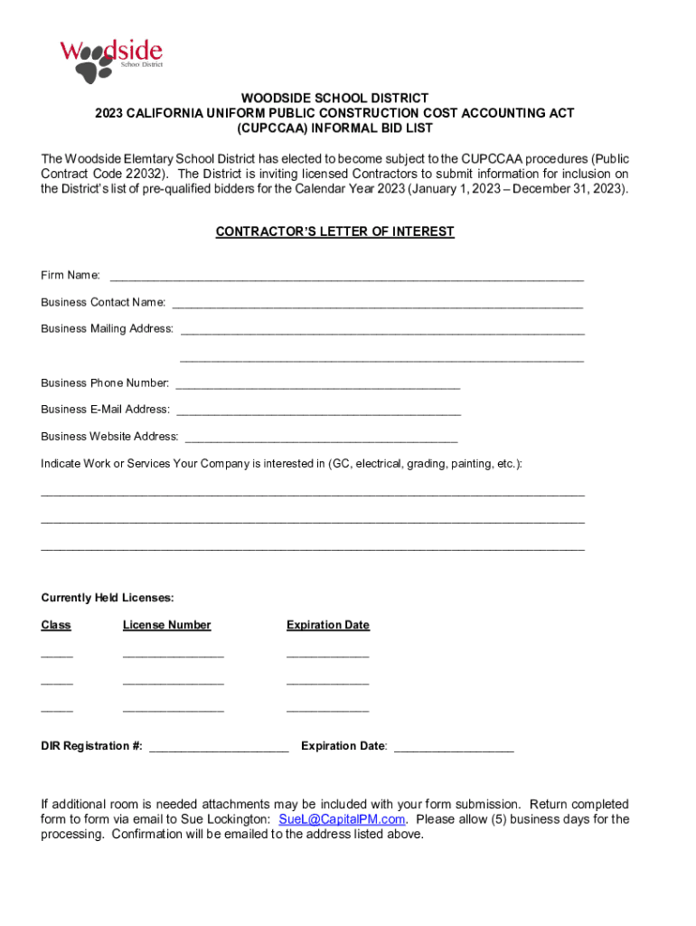 WOODSIDE SCHOOL DISTRICT 2023 CALIFORNIA UNIFORM PUBLIC CONSTRUCTION COST ACCOUNTING ACT (CUPOLA) INFORMAL BID LIST The Woodside Elementary School District has elected to become subject to the CUPOLA