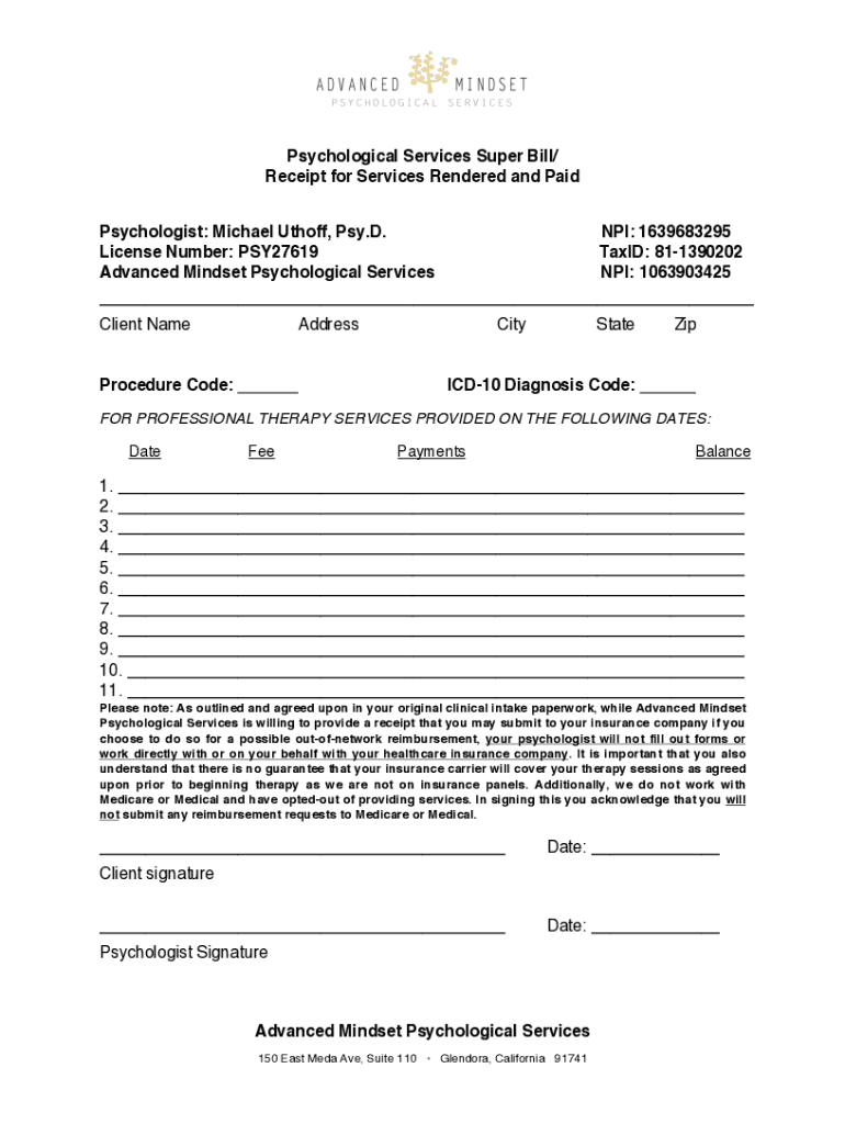 Psychological Services Super Bill/ Receipt for Services Rendered and Paid Psychologist: Michael Cutoff, Pay. D. License Number: PSY27619 Advanced Mindset Psychological Services NPI: 1639683295 Taxi: