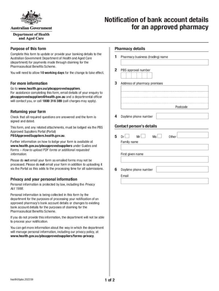 Get the free Notification of bank account details for an approved pharmacy