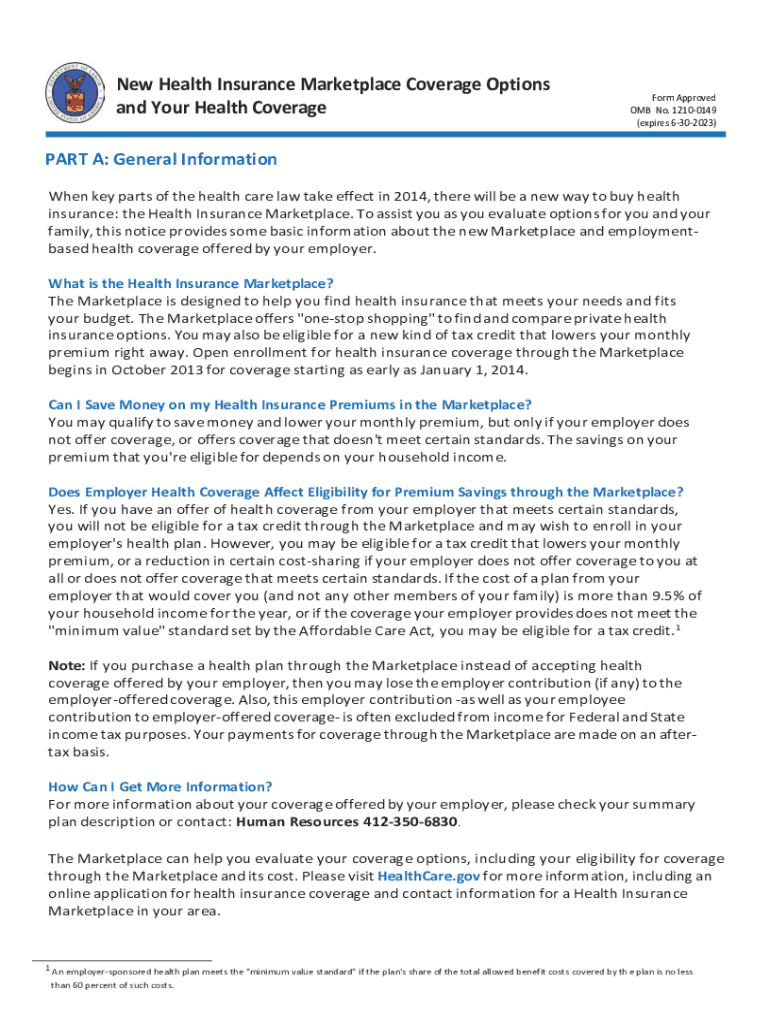 New Health Insurance Marketplace Coverage Options and Your Health CoverageForm Approved OMB No. 12100149 (expires 6302023)PART A: General Information When key parts of the health care law take effect