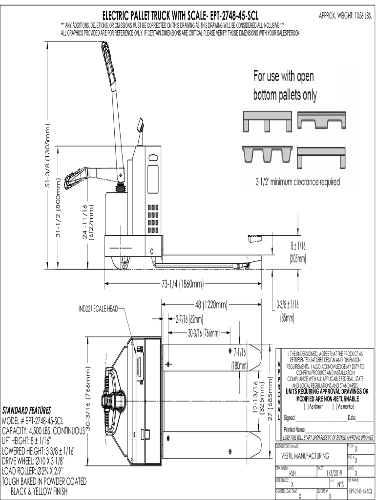 ELECTRIC PALLET TRUCK WITH SCALE EPT274845SCL3 1/2\” minimum clearance required24 11/16 (6f27mm)311/2 (800 mm)513/8 (1305 mm)*** ANY ADDITIONS, DELETIONS, OR OMISSIONS MUST BE CORRECTED ON THIS
