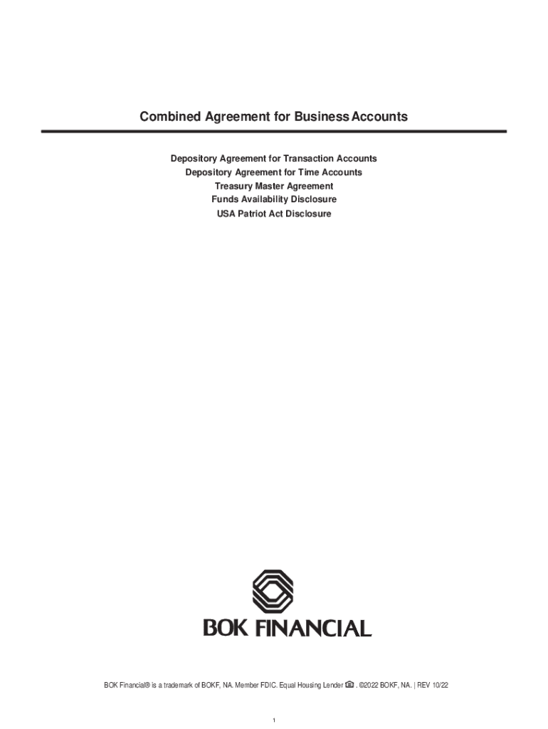 Combined Agreement for Business Accounts Depository Agreement for Transaction Accounts Depository Agreement for Time Accounts Treasury Master Agreement Funds Availability Disclosure USA Patriot Act