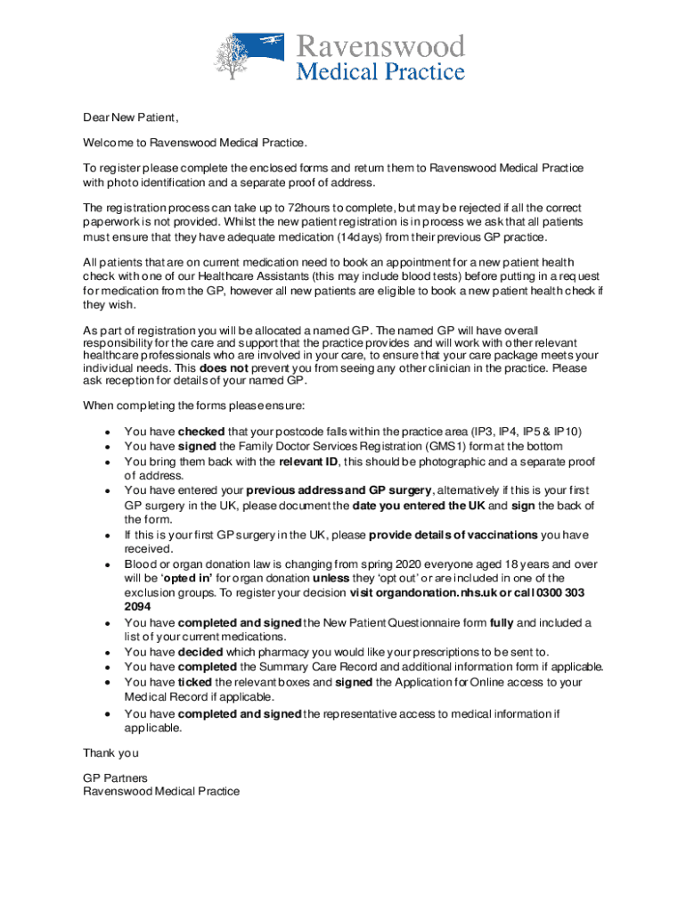 Dear New Patient, Welcome to Ravenswood Medical Practice. To register please complete the enclosed forms and return them to Ravenswood Medical Practice with photo identification and a separate proof