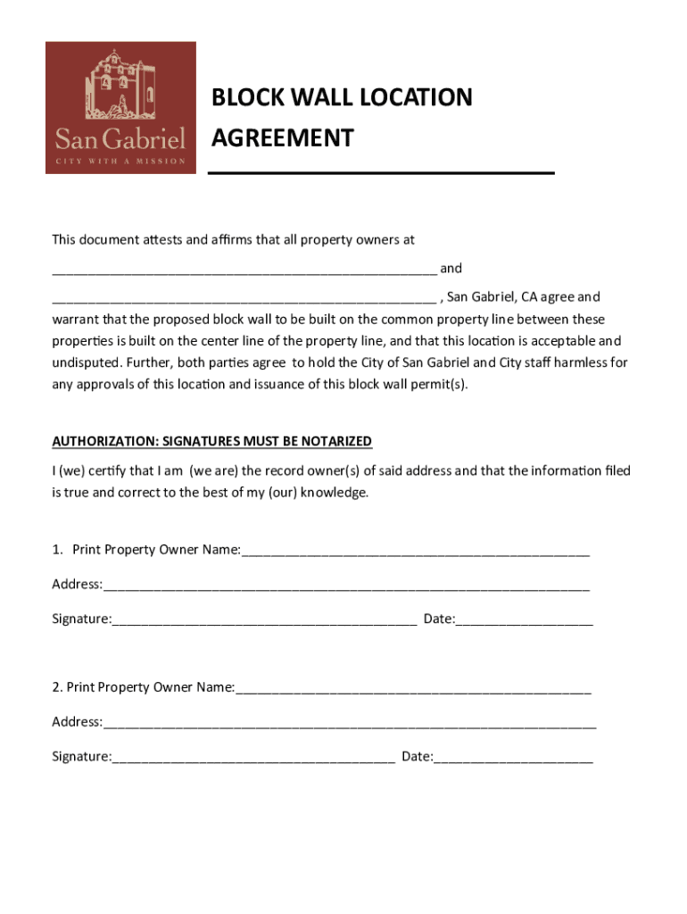 BLOCK WALL LOCATION Agreements document attests and affirms that all property owners at___ and ___, San Gabriel, CA agree and warrant that the proposed block wall to be built on the common property