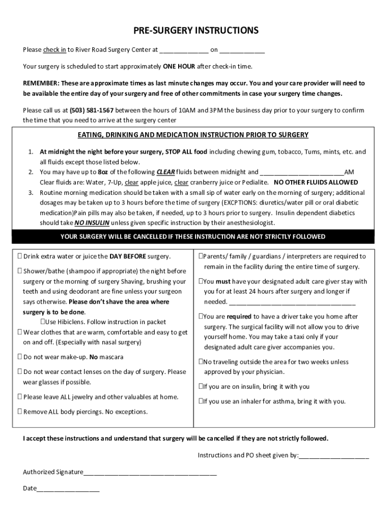 PRESURGERYINSTRUCTIONS PleasecheckintoRiverRoadSurgeryCenterat___on___ YoursurgeryisscheduledtostartapproximatelyONEHOURaftercheckintime. REMEMBER:Theseareapproximatetimesaslastminutechangesmayoccur.