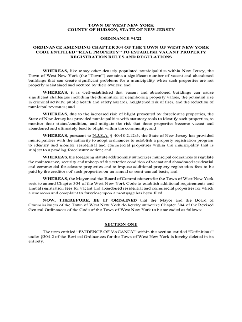 TOWN OF WEST NEW YORK COUNTY OF HUDSON, STATE OF NEW JERSEY ORDINANCE #4/22 ORDINANCE AMENDING CHAPTER 304 OF THE TOWN OF WEST NEW YORK CODE ENTITLED REAL PROPERTY TO ESTABLISH VACANT PROPERTY REGISTRATION