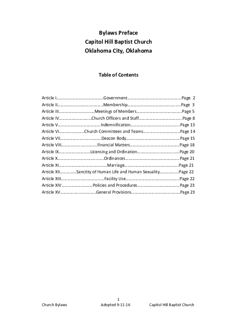Bylaws Preface Capitol Hill Baptist Church Oklahoma City, OklahomaTable of ContentsArticle I. Government..... Page 2 Article II......... Membership.......... Page 3 Article III................. Meetings