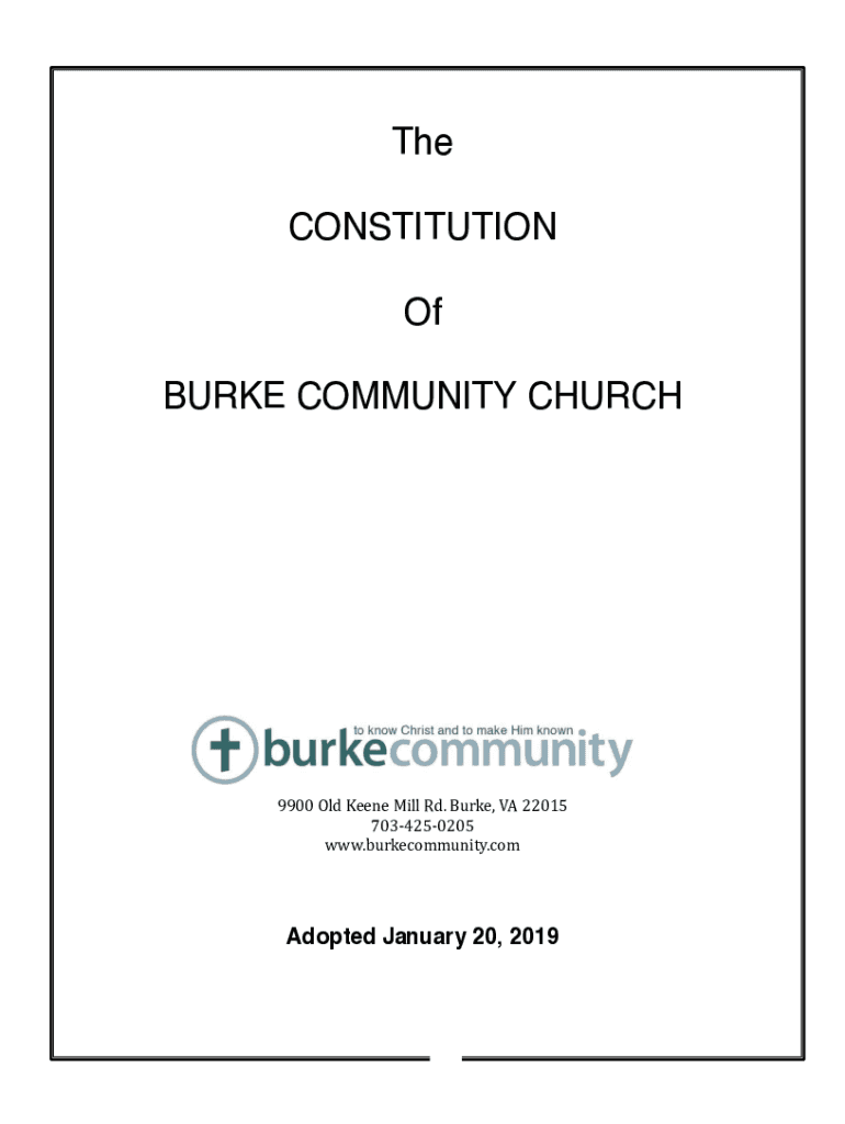 The CONSTITUTION Of BURKE COMMUNITY CHURCH9900 Old Keen Mill Rd. Burke, VA 22015 7034250205 www.burkecommunity.comAdopted January 20, 20190THE CONSTITUTION OF BURKE COMMUNITY CHURCH Adopted January